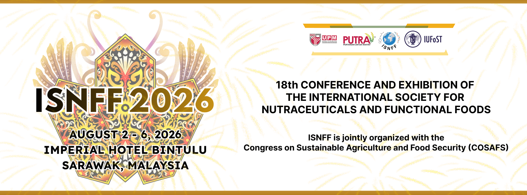 The 18th International Society for Nutraceuticals and Functional Foods (ISNFF) Conference and Exhibition will be held in Sarawak, Malaysia, jointly with the 3rd Congress on Sustainable Agriculture and Food Security (COSAFS), bringing together leading scientists, industry experts, and policymakers from around the world to share knowledge and discuss recent advances in nutraceuticals, functional foods, sustainable agriculture, and food security.